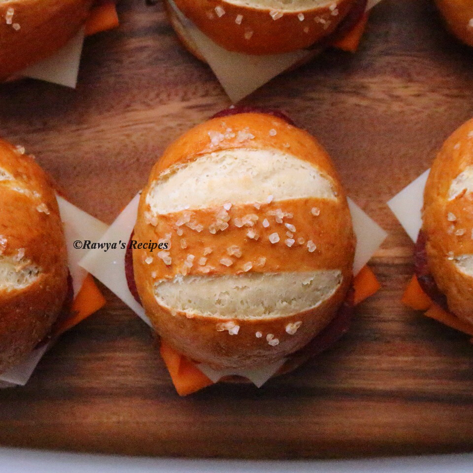 خبز البريتزل مع حشوة الأجبان والبيبروني والبصل المكرمل